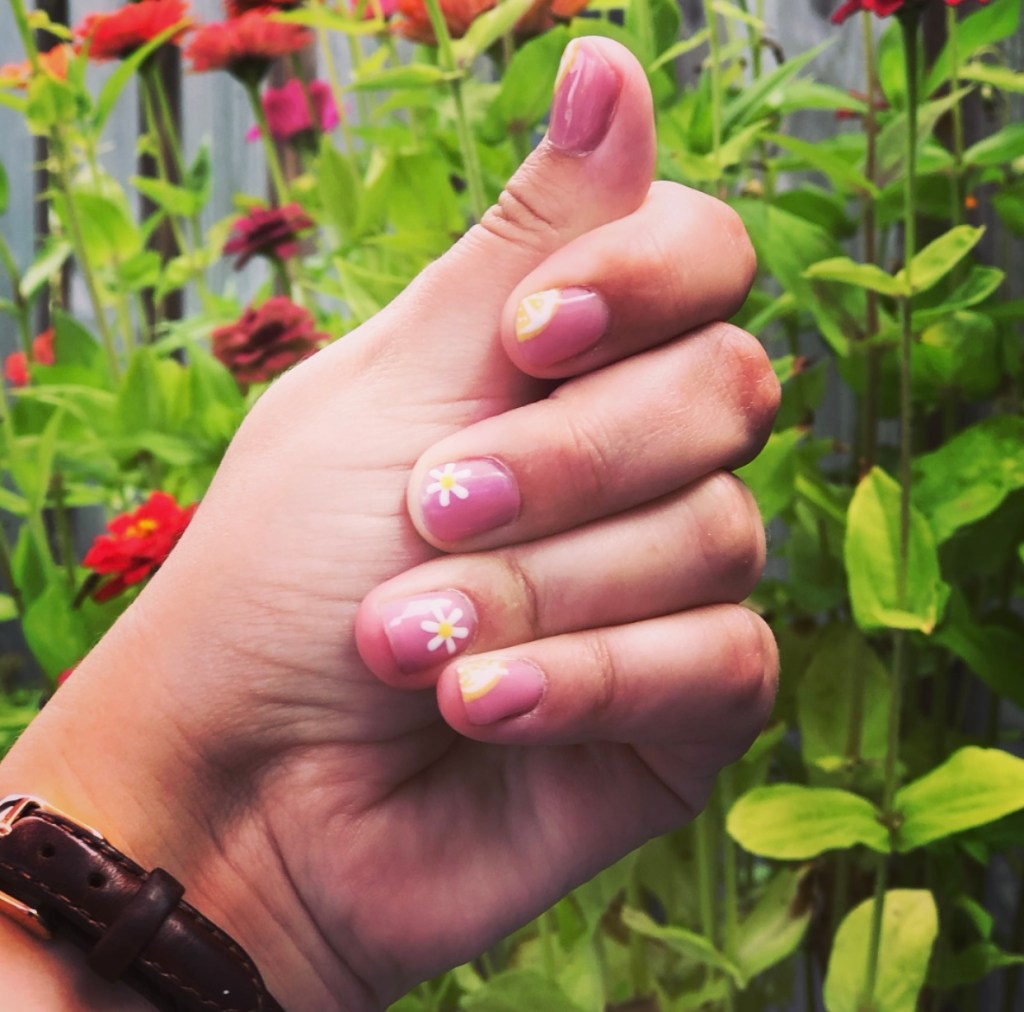 ‘Ik snap het wel,’ zeg ik. ‘Ik heb maandag ook mijn eerste schooldag op een nieuwe school. Ik hoef geen nieuwe rugzak, maar ik heb wel nieuwe nagels gekregen.’ Ik laat mijn nagels zien, die met citroenen en bloemetjes zijn gelakt. ‘Mooi,’ zegt ze vol bewondering, ‘kan je dat zelf?’ ‘Nee,’ antwoord ik, ‘dat doet mijn zusje.’ ‘Oh,’ zegt ze, ‘mijn zusje is 8 jaar. Die kan dat nog niet.’ ‘Mijn zusje is 28 jaar,’ leg ik uit, ‘en die kan het pas net.’