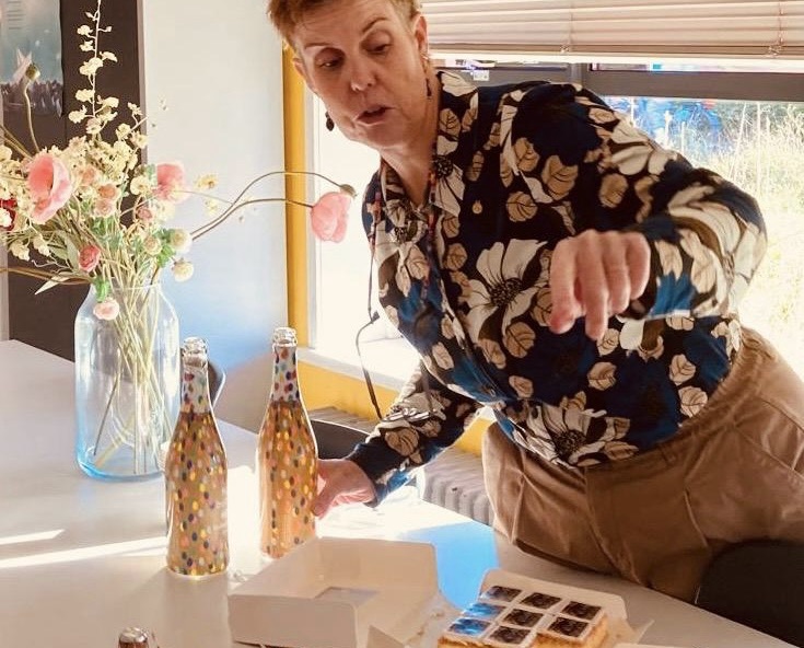 In de stroom van nog meer thee en chocolade en flarden van vragen en opmerkingen doe ik mijn best een soort aanloop van het feestje te creëren. Het feest blijkt al in volle gang. Taartjes met een foto van de klas, die gekke uiteraard, bubbels ofkaneelthee, vandaag hoef je niet eens te kiezen tussen honing en suiker.