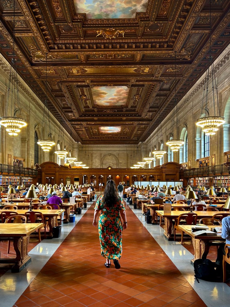 Afbeelding: Janneke in de leeszaal van de New York Public Library